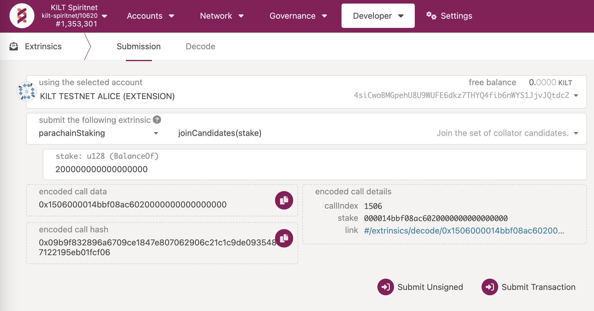 - Select your collator KILT address as the extrinsic submitter (the using the selected account field)