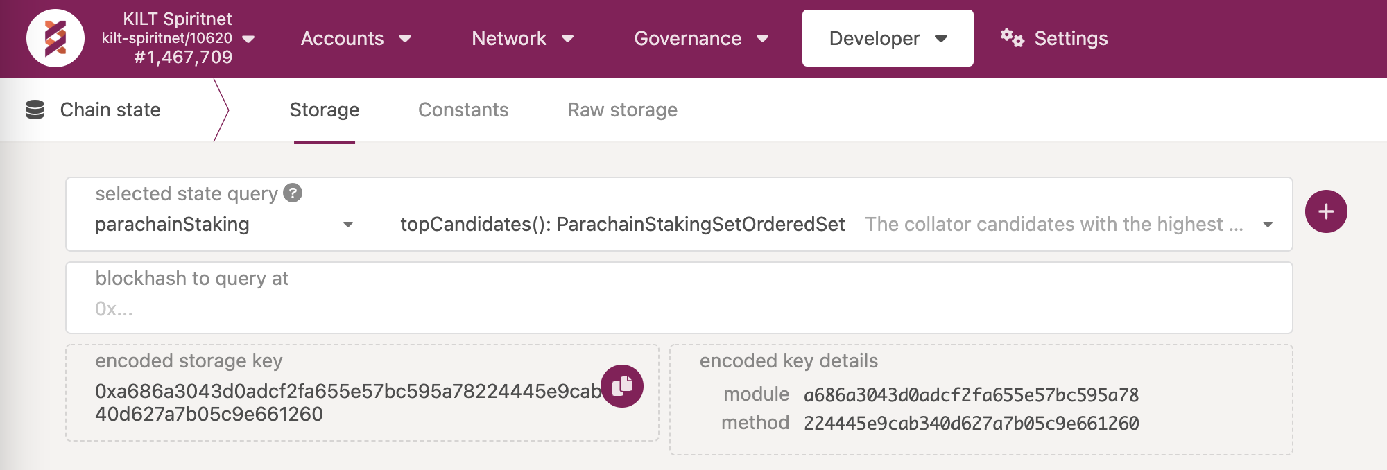 In Polkadot JS (wss://spiritnet.kilt.io, or wss://peregrine.kilt.io) go to Developer -> Chain state -> Storage