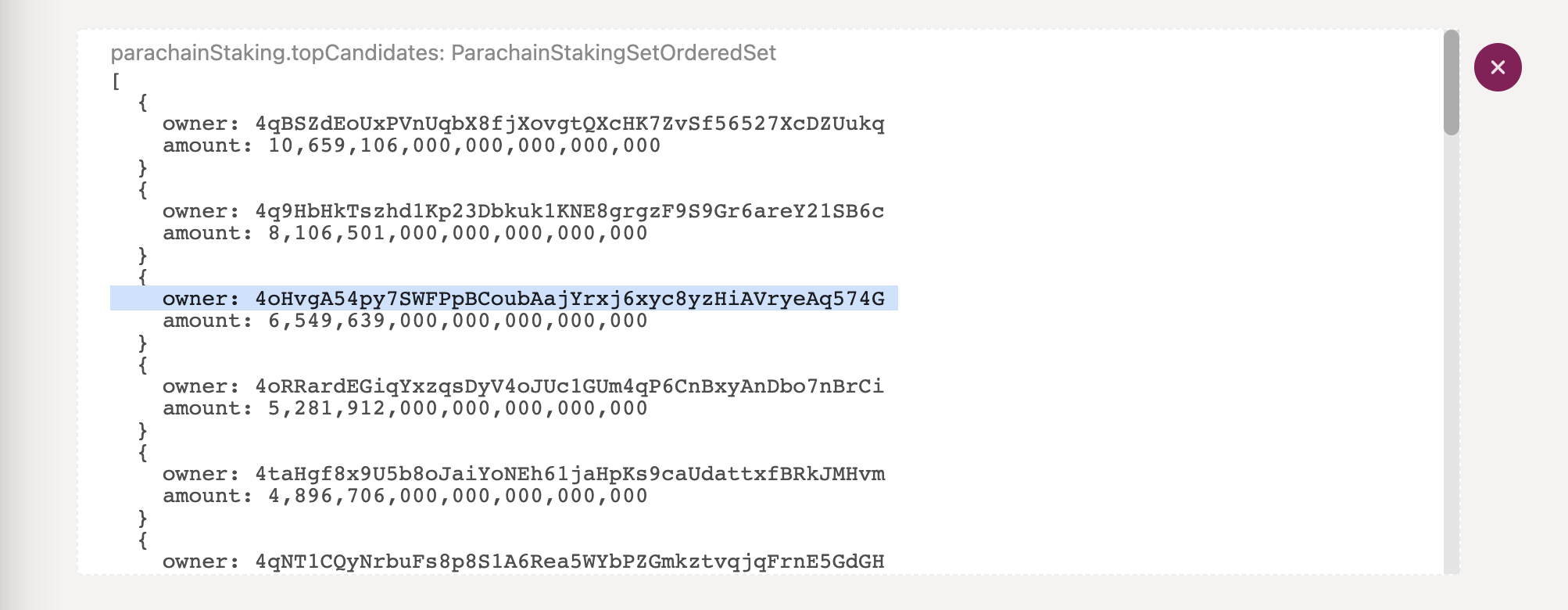 Now, you should see a window which lists collators (the owner field) ordered by their total stake (the amount field) from greatest to lowest.